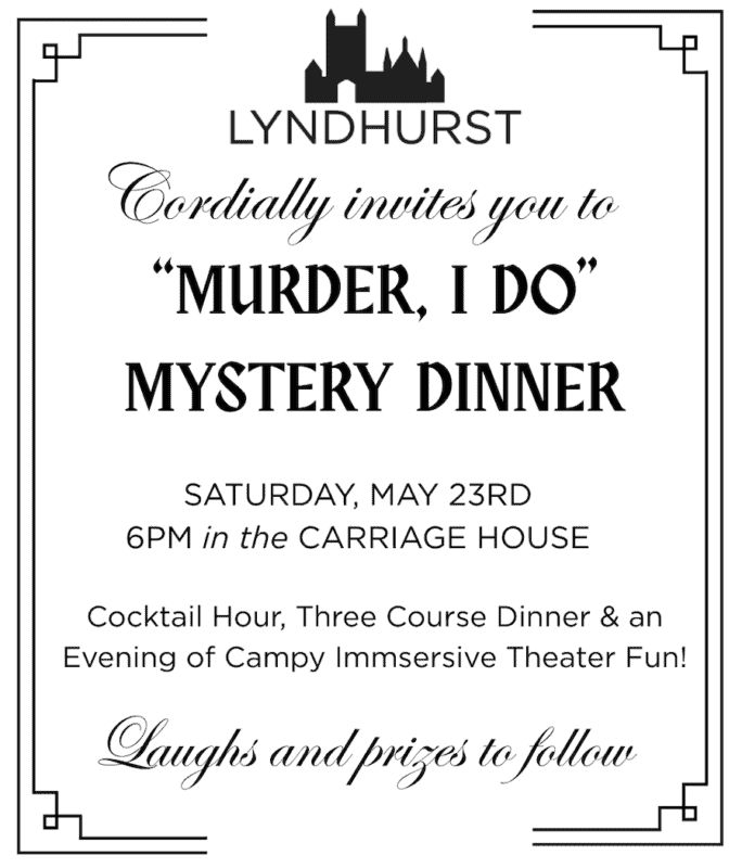 Join us in the Carriage House for “Murder, I Do” Lyndhurst’s first Murder Mystery Dinner!