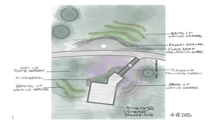 These plants provide habitat and nourishment for the birds, bees, and small animals that abound on the property. The bands of grasses and plants loosely form a mandala centered on the gazing ball, best viewed from the overlook’s elevated perspective.